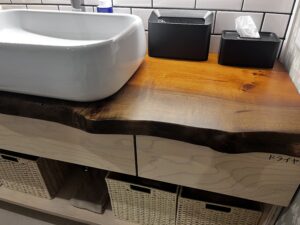 「rewood」とは、役目を終えた木材を加工して、新しい家具として再生させるブランド。キッチンの天板には座敷机を再生した一枚板が使われ、カウンター部分には机の脚を再生した遊び心溢れるデザインに仕上がっています。形の違う脚を並べることで、こんなにおしゃれに見えるんですね!