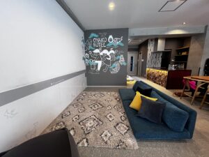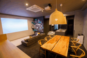 居心地のよい空間デザインも大きなポイントです。大きな壁面は子どもの落書きもOK! 白い壁にプロジェクターで動画を投影して、みんなで映画鑑賞も楽しめるんです。