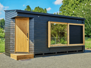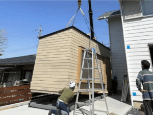 - トラックで運んで、駐車場一台分のスペースに設置できる、確認申請のいらない、固定資産税がかからない、動かせる小屋です。